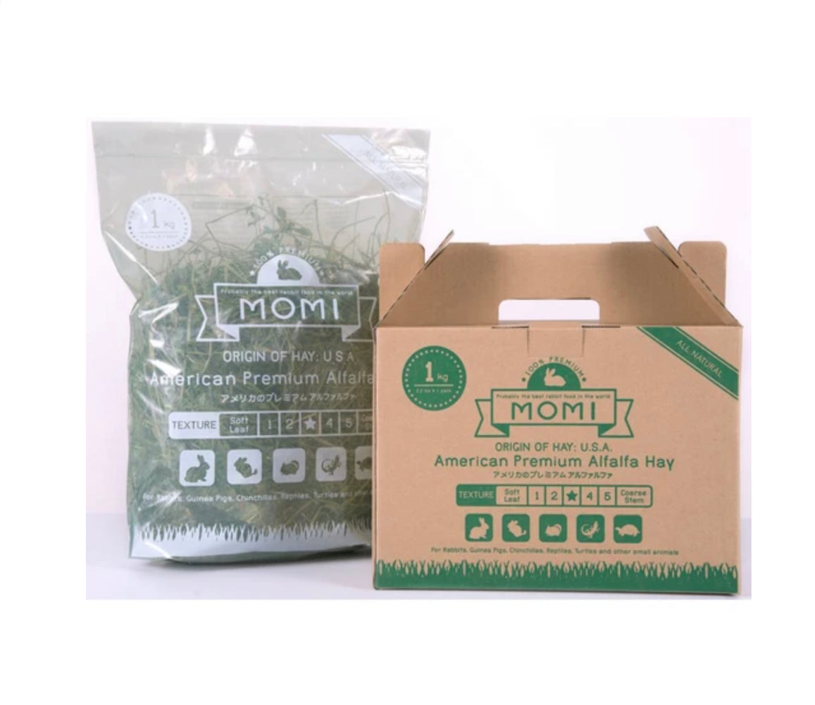 Momi Alfalfa Hay is rich in protein and calcium. It provides essential energy for growing. Recommended for small pets that are aged 6 months and below, gestating, lactating or post-surgery. Can be given occasionally to small pets aged above 6 months.